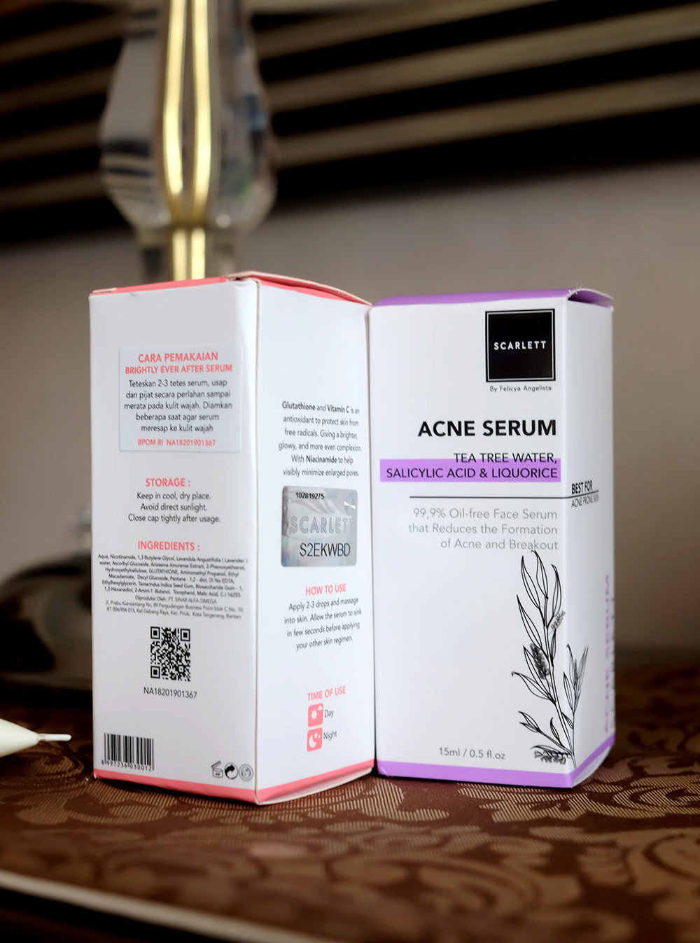 Cara membedakan kedua serum ini bisa teman-teman lihat dari warnanya, warna peach untuk  Brightly Ever After Serum sedangkan warna ungu untuk Acne Serum.
