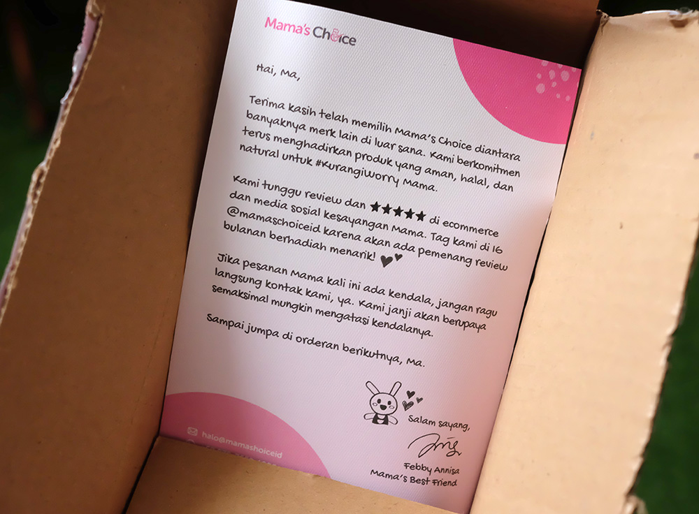 First impression saat unboxing didapat bukan dari produknya, melainkan dari greeting card nya. Entah kenapa baca greeting card nya berasa diajak ngobrol, kata-katanya menyentuh dan berasa diterima kasihin banget deh sama mba Febby Annisa. Entah gara-gara hormon menyusui, hormon kurang piknik, atau hormon yang lain tapi saat itu rasanya sebagai customer tuh kita dimuliakan.